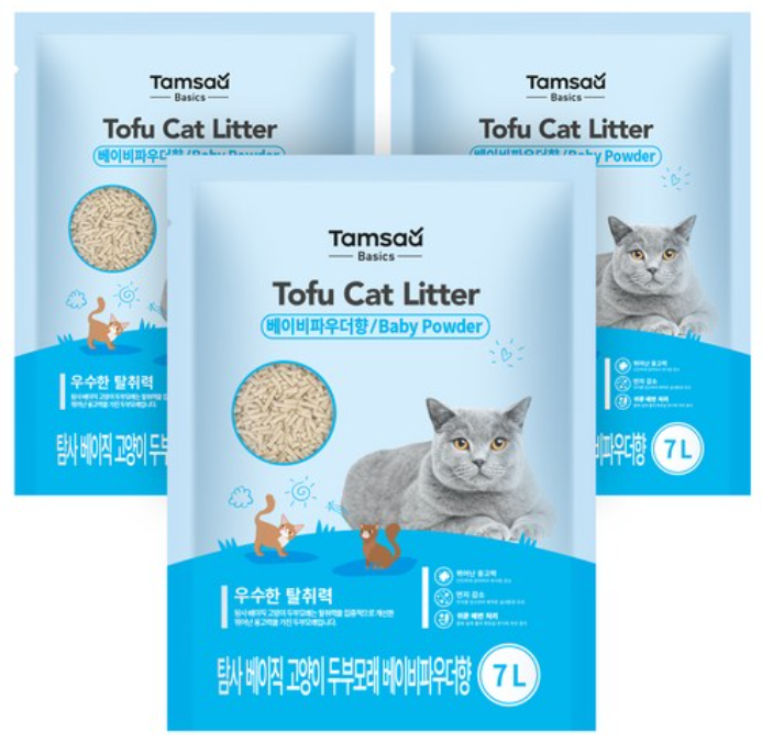 쿠팡에서 구입하여 사용하는 탐사 베이직 프리미엄 고양이 두부모래 베이비파우더향 7L